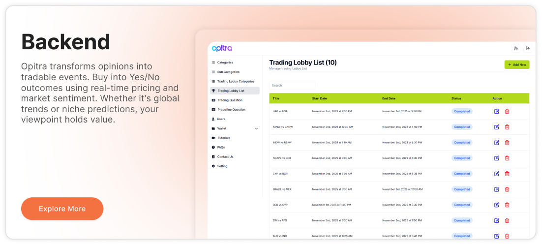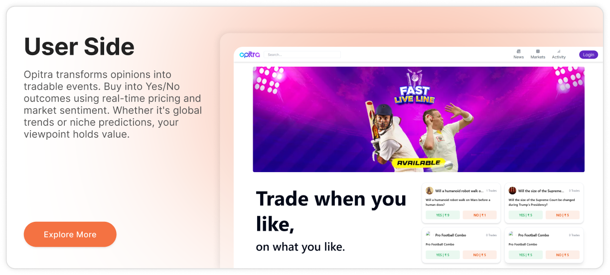 We provide a ready-to-deploy opinion trading app that can be fully customized — from branding and categories to integrations and APIs — offering both speed and flexibility.